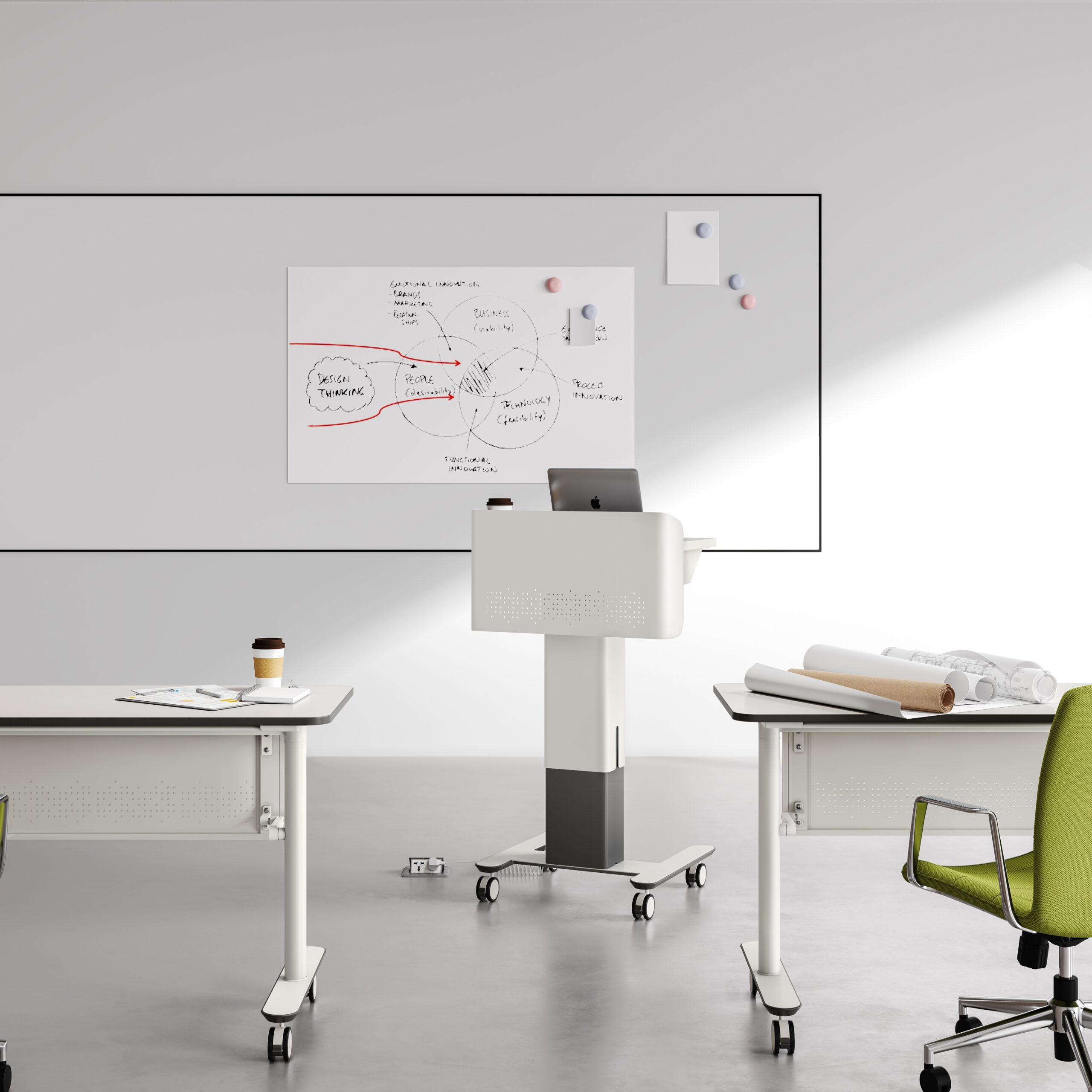 El podio incluye funciones integradas para carga y almacenamiento, ofreciendo una solución práctica que eleva tu rendimiento en cualquier entorno profesional.
