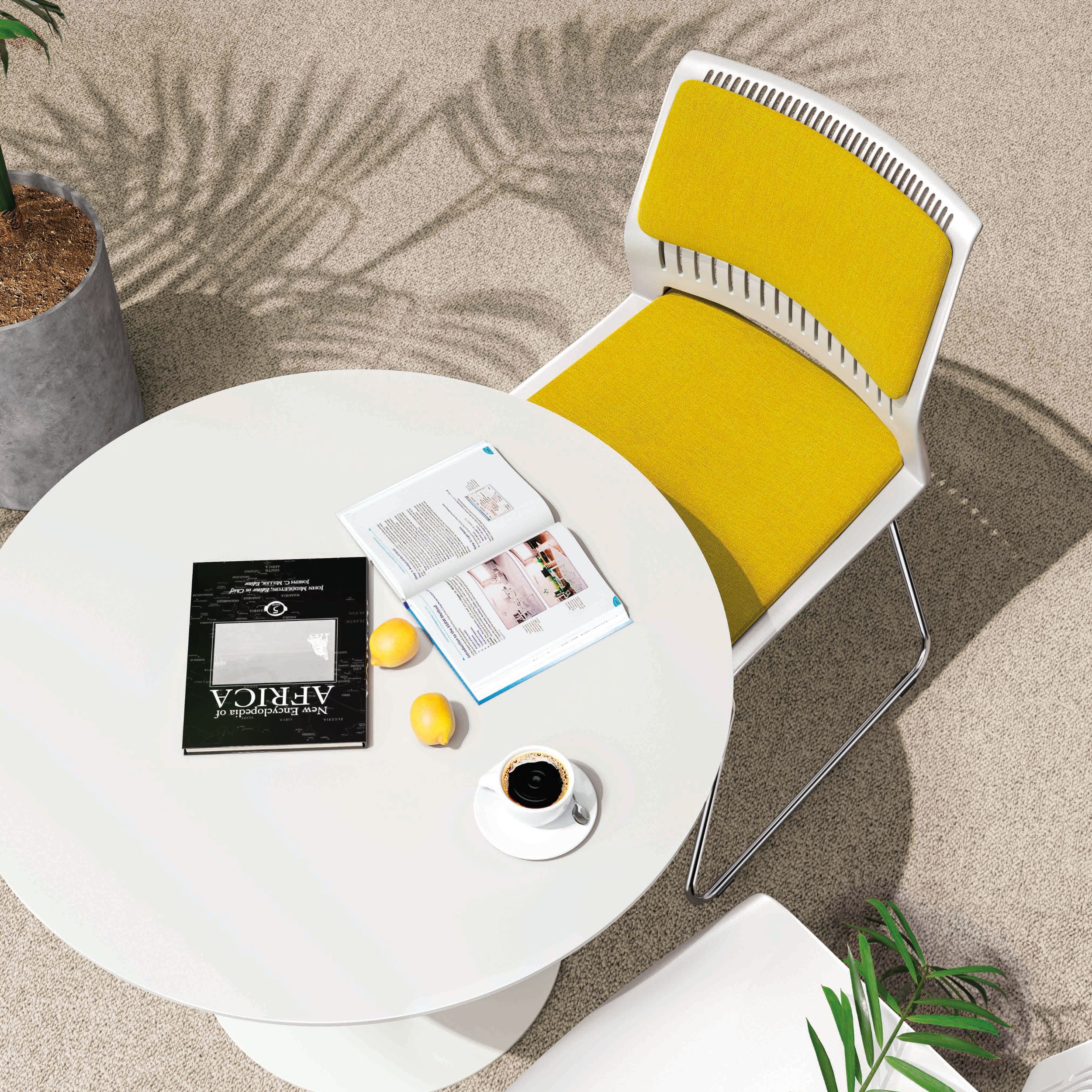Las patas estilizadas, inspiradas en las garras de un ave, facilitan el apilado y la movilidad, adaptándose a espacios de trabajo, cafeterías, salas de espera y hogares.