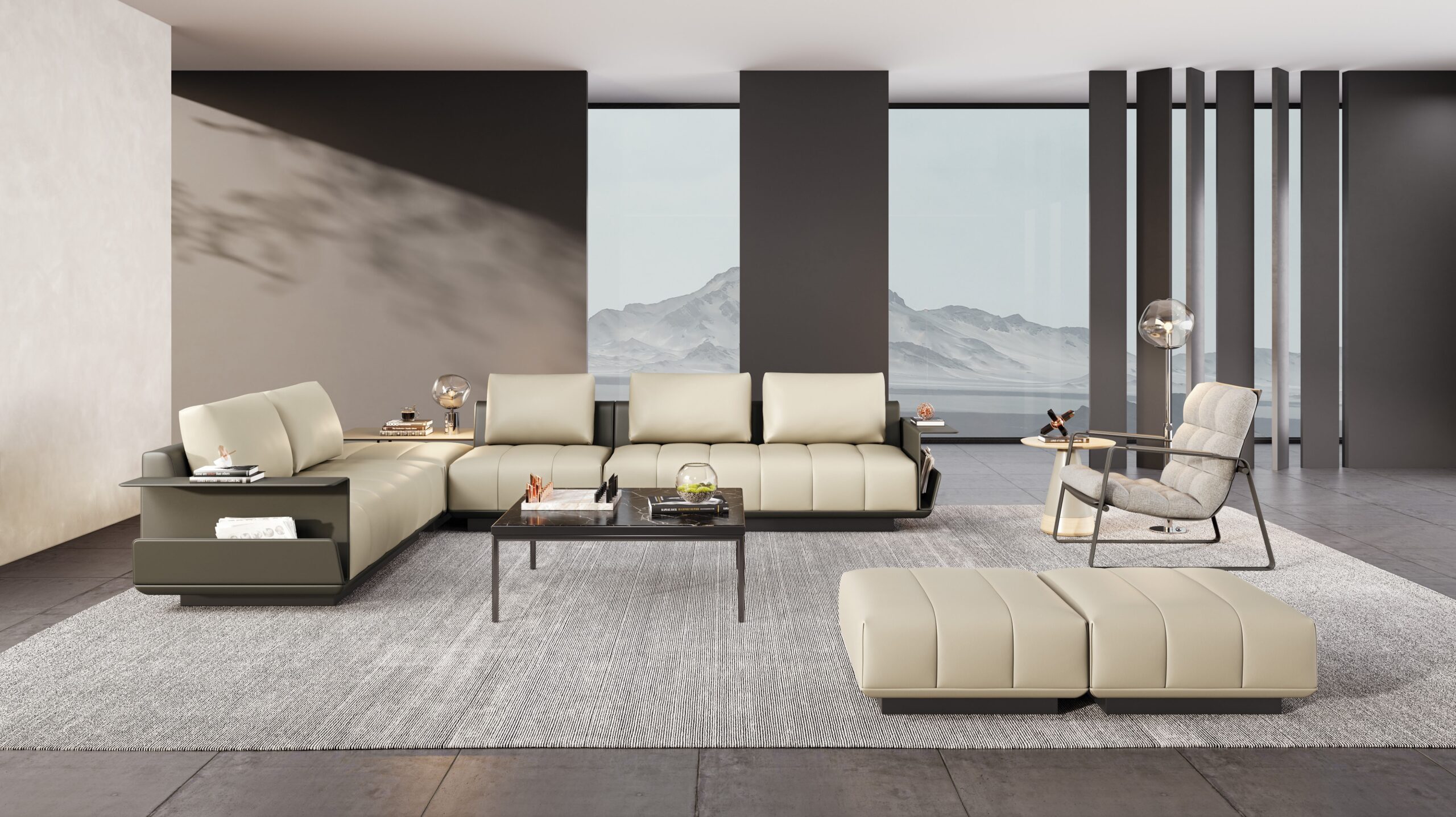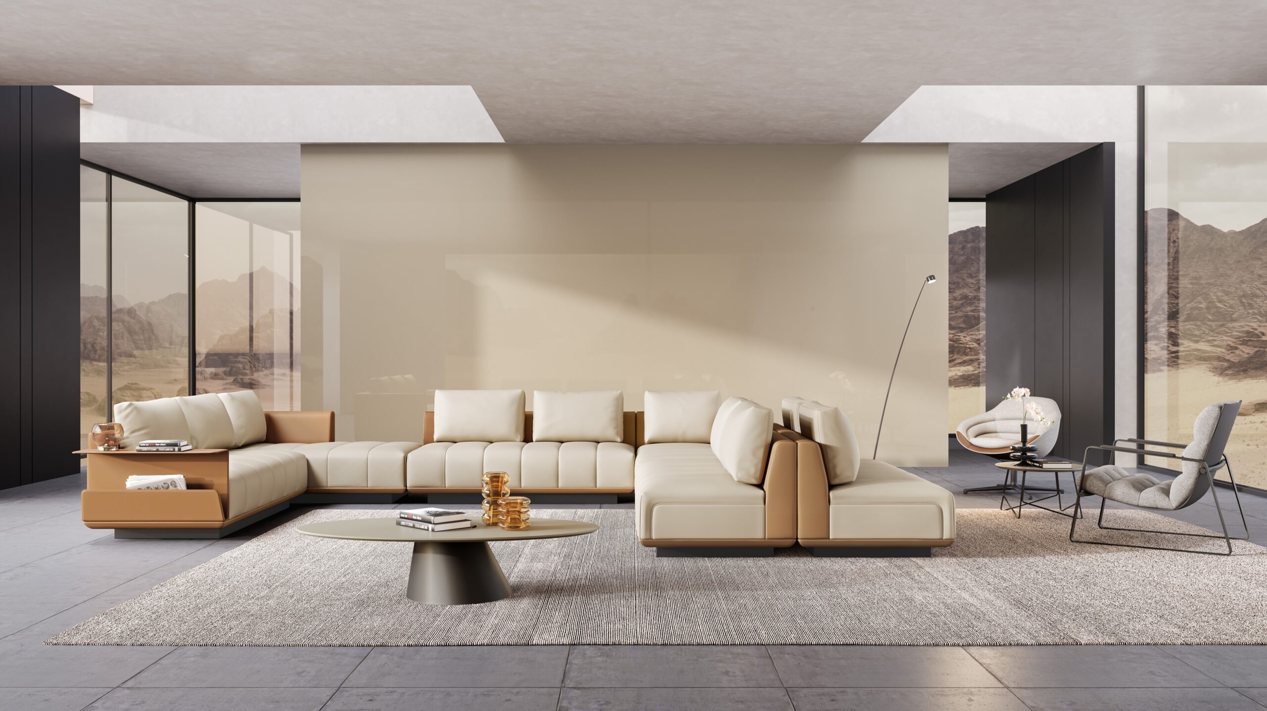 El diseño integrado de las mesas laterales y los reposabrazos combina forma y función en una estructura única. Con cuero de silla de montar resistente a manchas, agua, sudor y moho, cada detalle habla de la artesanía y atención meticulosa que caracteriza esta serie.